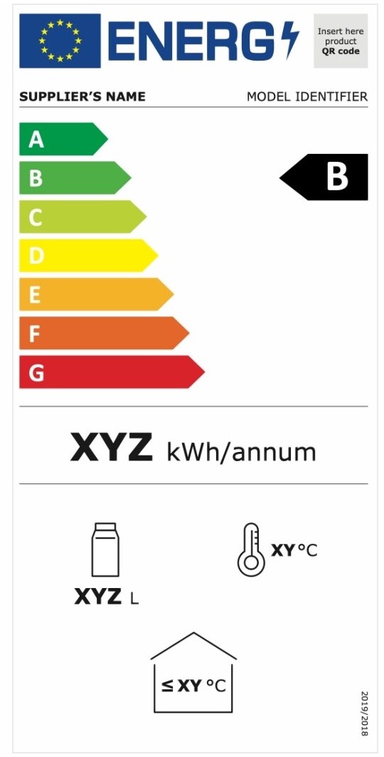 La etiqueta energética es una etiqueta adherida al producto que muestra su clasificación energética mediante una escala de colores y letras, que va desde la A (más eficiente) hasta la G (menos eficiente).